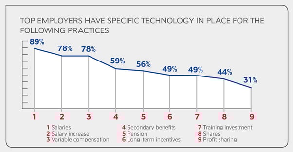 Within 78% of participants both the merit increase and variable compensation elements are supported by technology, with secondary benefits being supported within only 59% and training investment 49%. Clearly there is room for greater integration between technology and the wider range of offerings that now contribute towards Total Rewards.