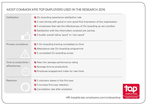 As On-boarding processes evolve, it is increasingly important to track key metrics and measure the impact and effectiveness of the programme, particularly if the aim is to assimilate new employees quickly, smoothly and effectively, helping them become productive and aligned with business values and goals.Measurement is one area in which all certified Top Employers are consistently improving their efforts, with all aspects showing higher usage than previous years (see table below). There are two main areas to look at. The first area is a check on the progress of employees, ensuring that the On-boarding process is effective, and the second is to reflect on the process itself, looking at areas for improvement or refinement. The most popular measures cover both of these areas.